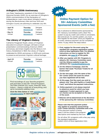 Register online or by phone | arlingtonva.us/55Plus | 703-228-4747 13CATEGORYArlington%u2019s 250th AnniversaryJoin Peter Vaselopulos, president of the Arlington Historical Society (AHS), for an overview of Arlington%u2019s 250th commemoration of the Declaration of Independence. Learn more about Arlington%u2019s history during the Revolutionary War and how AHS and Arlington County are planning to celebrate July 4th.%u2022 April 16 Thursday 3-4 p.m.Virtual #913400-18 1 session%u2022 May 14 Thursday 3-4 p.m.Virtual #913400-19 1 sessionThe Library of Virginia%u2019s HistoryCatherine Fitzgerald Wyatt, Library of Virginia%u2019s education & outreach manager, will lead a virtual presentation commemorating America%u2019s 250th anniversary and share insights into the library%u2019s rich history. Established in 1823, the Library of Virginia celebrated its 200th anniversary in 2023 and continues to preserve and promote Virginia%u2019s cultural heritage.%u2022 April 23 Thursday 3-4 p.m.Virtual #913400-20 1 sessionOnline Payment Option for 55+ Advisory Committee Sponsored Events (with a fee)Pay in advance to attend events sponsored by 55+ Advisory Committees (with a fee)! This system to pay by credit card online is convenient, fast and secure. To use this system, you must first register for the event. Once you register for an event, advance payment can be completed online. To pay, follow the steps belo 1. First, register for the event using thestandard 55+ programs registration system(click on blue registration link). For detailedinstructions on how to register for 55+programs, see page 55 of this guide.2. After you register with 55+ Programs toattend a 55+ Advisory Committee event,visit the Alliance website to pay theadmission fee: friendsofthealliance.org3. On the Alliance homepage, click thebanner that reads %u201cPurchase Tickets for allEvents Here%u201d4. On the new page, click the name of the55+ Center where the event for whichyou have registered will be held.5. At this page, find the event you wish toattend, click %u201cPay with PayPal or Credit/DebitCard,%u201d and follow the payment instructions.6. Online payment is not always requiredto attend an event for which you haveregistered. If noted, payment in cash(or checks) can be accepted on the dayof the event.7. Refunds will be determined at the discretionof the sponsoring 55+ Advisory Committee.Please note that this payment system only applies to programs sponsored by a 55+ Center Advisory Committee with a fee.If this payment system is being used, it will be noted in the program description and marked by the icon:For all other 55+ programs with a fee, pay using the standard registration system (click on blue registration link).Find recordings of your favorite programs and activities on the 55+ Virtual Programs YouTube channel! Art, music, exercise, food, history %u2013 there%u2019s a little bit of everything, and we%u2019re constantly adding more. Click the links below or visit youtube.com/virtualprograms to start exploring!ARLINGTON COUNTYPRESENTATIONThe Military Women%u2019s MemorialPRESENTATIONWake and MakePRESENTATIONResponsibilities of an ExecutorIntergenerational Photo Contest & Show