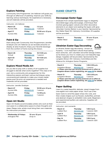 24 Arlington County 55+ Guide | Spring 2026 | arlingtonva.us/55PlusCATEGORYExplore PaintingCommunity Arts Programmer Jim Halloran will guide you through an afternoon of painting. Improve your skills by learning various techniques. No experience is necessary, and all materials will be provided.Instructor: Jim Halloran%u2022 March 25 Friday 1-2 p.m.Aurora Hills #913303-06 1 session%u2022 April 17 Friday 10:30 a.m.-12 p.m.Aurora Hills #913303-07 1 sessionPaint & SipPaint along with Community Arts Programmers Jennifer Droblyen and Jim Halloran as we recreate artworks on display at area museums. Enjoy your favorite beverage from the comfort of home during this lesson.%u2022 March 26 Thursday 10-11:30 a.m.Virtual #913303-08 1 session%u2022 April 30 Thursday 10-11:30 a.m.Virtual #913303-09 1 sessionExplore Mixed Media ArtDo you like to play with a variety of art supplies but struggle to decide what works together? This class is for you! Join a community arts programmer for this interactive session and learn various techniques using unconventional materials to make your mixed media pieces pop! No prior art experience is needed and materials will be provided. Instructor: Jennifer Droblyen%u2022 March 27 Friday 10:30 a.m.-12 p.m.Aurora Hills #913303-10 1 session%u2022 April 10 Friday 1-2:30 p.m.Aurora Hills #913303-11 1 sessionOpen Art StudioOpen Art Studio accommodates artists who work at their own pace in a collaborative space to share thoughts and ideas. Please note: artists must bring their own materials. No instruction provided.%u2022 Wednesday & Fridays 10 a.m.-12 p.m.Arlington Mill Drop-inHAND CRAFTSDecoupage Easter EggsGraduate from simple dyed Easter eggs to elegantly decorated eggs using decoupage, a technique that involves gluing paper cutouts and other decorative elements to an object and sealing the layers with glue. Volunteer Carolyn Bainer is your teacher. Sponsored by the Walter Reed 55+ Advisory Committee. All supplies will be provided.%u2022 March 5 Thursday 10 a.m.-12 p.m.Walter Reed #913310-01 1 sessionUkrainian Easter Egg Decorating In Ukraine, Easter egg decorating %u2013 known as Pysanky %u2013 is an important cultural ritual dating back centuries. Join volunteer and artist George Ziobro as he shows you how to create your own beautiful egg design. Supplies will be provided. Sponsored by the Langston Brown 55+ Advisory Committee and the Alliance for Arlington Senior Programs.%u2022 March 5 Thursday 1:30-3:30 p.m.Langston-Brown #913310-02 1 sessionPlease note that new security protocols are in effect at Langston-Brown: before registering, see page 29 for details.%u2022 March 12 Thursday 1:30-3:30 p.m.Langston-Brown #913310-03 1 sessionPlease note that new security protocols are in effect at Langston-Brown: before registering, see page 29 for details.Paper QuillingLearn to create beautiful, delicate, raised images from one-eighth inch wide paper strips. You%u2019ll use a few basic tools to wind the paper strips into coils, and then create shapes such as flowers, butterflies, animals and abstract shapes to embellish note cards. Beginners and experienced quillers are welcome. Supplies will be provided.Instructor: Joni Leonardo%u2022 March 12 Thursday 1:30-3 p.m.Lubber Run #913310-04 1 session: $20%u2022 April 9 Thursday 1:30-3 p.m.Lubber Run #913310-05 1 session: $20%u2022 May 14 Thursday 1:30-3 p.m.Lubber Run #913310-06 1 session: $20
