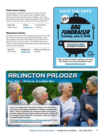 Register online or by phone | arlingtonva.us/55Plus | 703-228-4747 7CATEGORYPride Dance BingoDance Bingo, created and led by 55+ Center Director Jennifer Weber, is a fun game that combines cardio dancing with the luck of the draw of Bingo. Join us for this special Pride edition featuring anthems from LGBTQ+ icons! You will be sure to sweat and have a good time!%u2022 March 20 Friday 11 a.m.-12 p.m. Walter Reed #913802-02 1 sessionRhinestone RodeoCome for 120 minutes of non-stop dancing at Aurora Hills 55+ Center%u2019s second annual Rhinestone Rodeo, which also happens to be the International Day of Dance! Two dance rooms, two instructors %u2013 Suzie Pratts and Hanni Cordes. All skill levels are welcome. Bring water and wear your best dancing feet!%u2022 April 29 Wednesday 10:30 a.m.-12:30 p.m. Aurora Hills #913802-04 1 sessionJoin us at Lubber Run Community Center for a live music street fair as Arlington celebrates all things recreation and music. There%u2019s something for everyone when food trucks, artisans, moon bounces, games and community vendors fill the streets. Come inside the community center for various programming for all ages.Visit https://www.arlingtonva.us/arlingtonpalooza for more information and details about the event.ARLINGTON PALOOZASat., May 9, 12-5 p.m. at Lubber RunSAVE THE DATE Stay tuned for details coming in the next 55+ Guide. For more information visit: friendsofthealliance.org.at Rocklands BBQ (Arlington location)Tuesday, June 2, 2026BBQFUNDRAISER